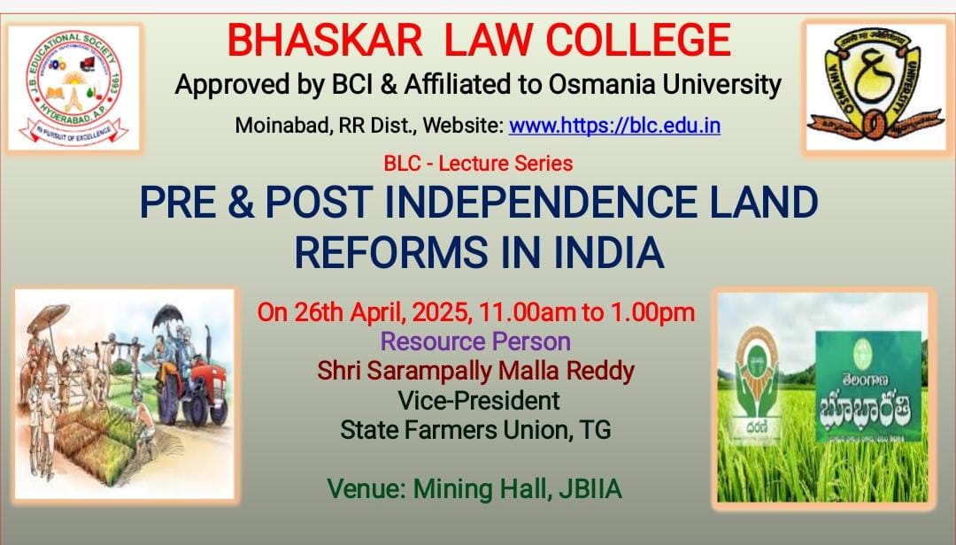 Guest Lecture on "PRE & POST INDEPENDECE LAND REFORMS IN INDIA" by Shri Sarampally Malla Reddy (Vice-President State Farmars Union, TG) on 26th April 2025.