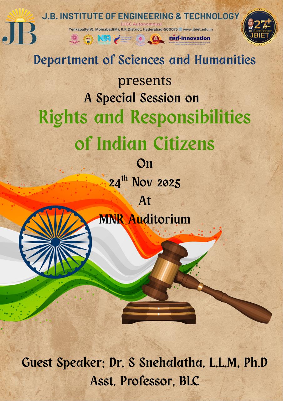 The 76th National Constitution Day was celebrated at BLC. As part of the celebrations on 24th November 2025, Dr. S. Sneha Latha, a faculty member of BLC, delivered a lecture at JBIET, Mr. Venu, a faculty member of BLC, delivered a lecture at JBRPC.